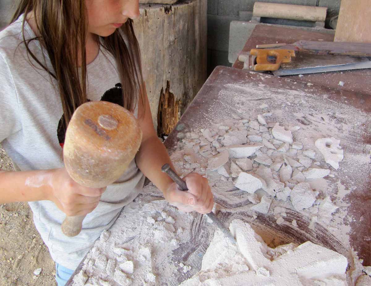 Mit Hammer und Meißel werden wir kleine Bildhauer!  Mit Hilfe von Stift und Papier überlegen wir uns, wie unsere Figuren aussehen sollen – ein guter Plan ist wichtig, bevor es ans Werk geht.